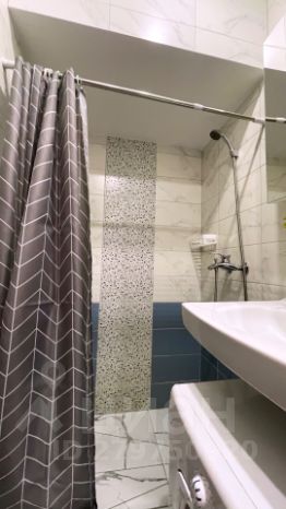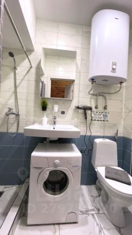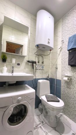 Чистый в кафель. Душевая кабина, туалет, раковина, стиральная машина, шкаф-зеркало, полотенцесушитель, водонагреватель.