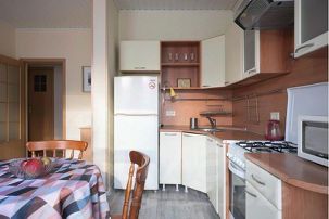 газовая плита, духовка, микроволновая печь, чайник, холодильник и необходимая посуда