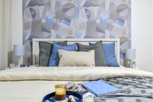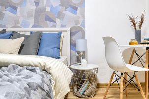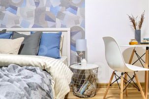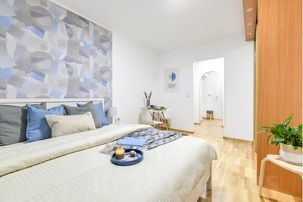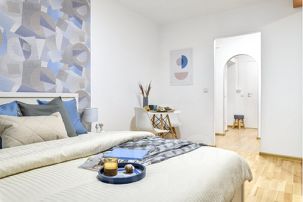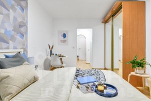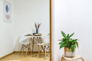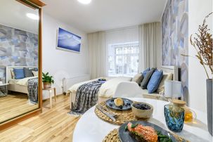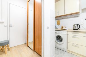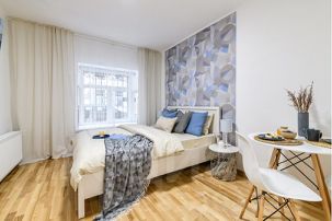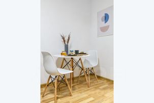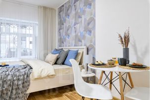 Небольшая квартира для двух гостей с двуспальной кроватью, оборудована небольшим, но функциональным кухонным уголком, стильным обеденным столом и парой уютных кресел.