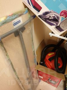 стиральная машина(с сушкой), пылесос, утюг, гладильная доска, фен,