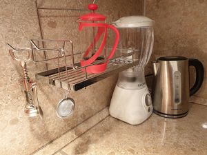 миксер/блендер, чайник, сушилка для одежды, кухонная утварь и посуда для двух человек.