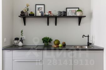 Кухня с индукционной плитой, холодильник с морозилкой, стиральная машина, вся посуда для приготовления и сервировки.