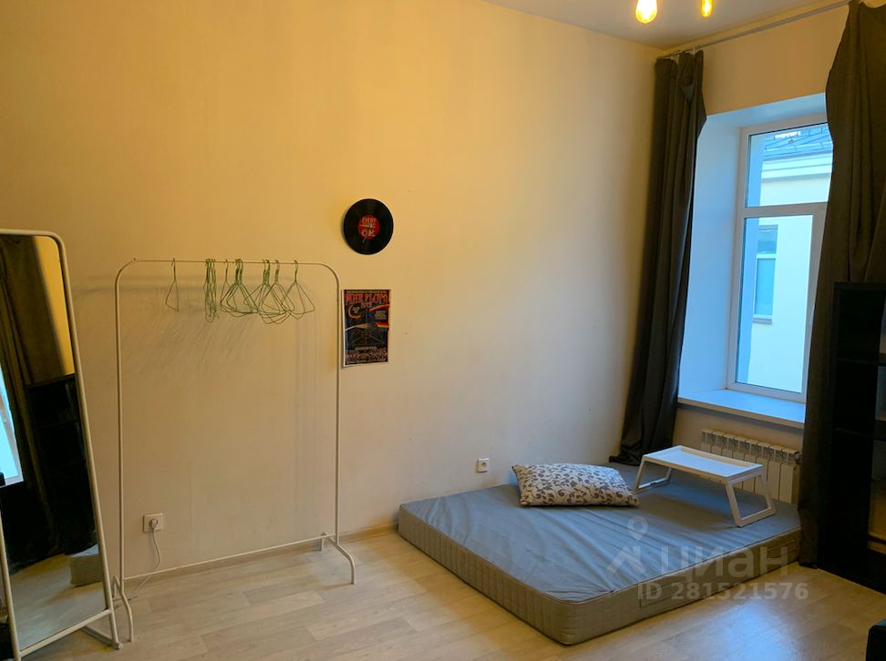 В комнате - большой матрац, рейл для одежды, большое зеркало, кухонный уголок, кожаный диван (раскладывается), тумба под телевизор, журнальный столик и комод.