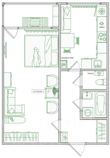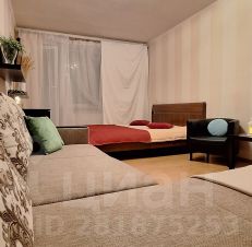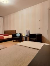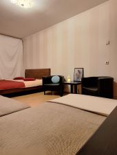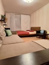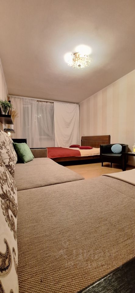 Спальные места: в комнате 2х спальная кровать и большой 2х спальный диван; на кухне еще один 2х спальный диван. Расположение спальных мест смотрите на плане квартиры, прикреплен к фото.
