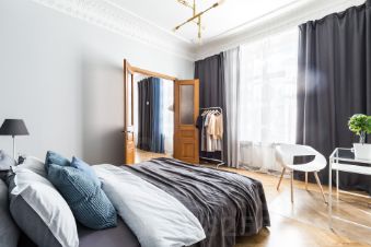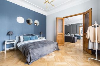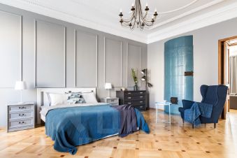 ДИЗАЙН. Апартаменты Avenue — это классический интерьер в современной интерпретации. Все помещения выполнены в благородных серых и синих оттенках, с акцентами из натурального дерева. Двери из массива подчёркивают впечатляющую высоту потолков