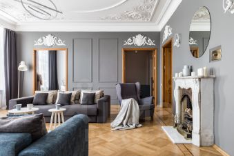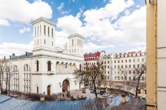 Просторные апартаменты в центре Петербурга, в которых легко почувствовать атмосферу старого города: из окон открывается вид на Большую Конюшенную улицу и церковь Петра и Павла, а в интерьере сохранились исторические камины и лепнина.