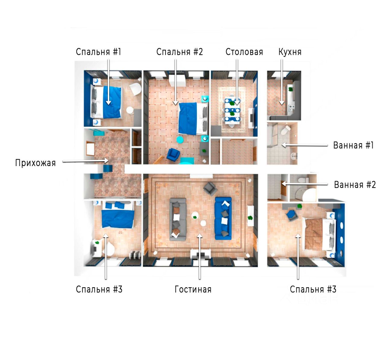 ПЛАНИРОВКА. Площадь апартаментов составляет 180 кв. м. Планировка включает просторную гостиную площадью 50 кв. м, кухню со столовой зоной, четыре изолированные спальни, два санузла.
