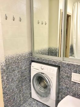 В квартире есть: шкаф, комод, телевизор с антенной на каналы в HD качестве, утюг, гладильная доска, сушилка, двуспальная кровать, текстиль, чайник, кухня, посуда, 2 стула, холодильник, стиральная машина, микроволновка.