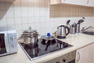 - Полноценная кухня с варочной поверхностью, духовым шкафом, посудомойкой, холодильником, СВЧ печью, электрочайником и всей необходимой посудой и кухонной утварью