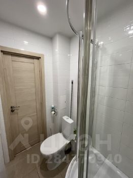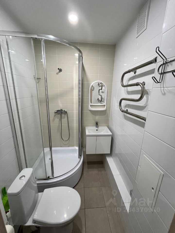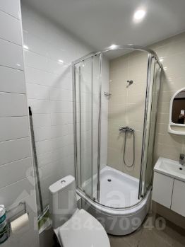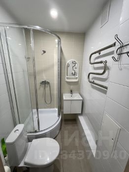 В санузле оборудовано все необходимое - душевая кабина, раковина и тумба для хранения, зеркало, имеется полотенцесушитель и две влагозащищенные розетки.