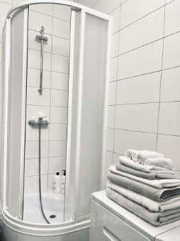 Просторный санузел с душевой кабиной и необходимыми принадлежностями для гигиены.