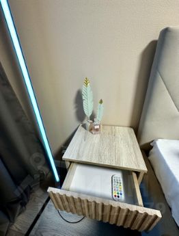 СПАЛЬНЯ: большая двухместная кровать с ортопедическим матрасом, люфт-системой и зоной хранения. LED торшер напольный с 28 режимами подсветки, потолочная светодиодная люстра с 3 режимами освещения с пульта, парящие прикроватные тумбы, шторы blackout, напольное дизайнерское зеркало в полный рост в золотой раме, комплект Новых подушек, в том числе декоративных, уютные вязаные пледы.
