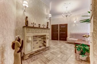 Студия закрывается на металлическую дверь, имеет индивидуальную ванную комнату (душевая, туалет и раковина) и кухонный уголок (приготовить блюда можно в многофункциональной мультиварке). Вход в студию из холла, украшенного камином.