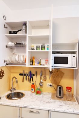 Квартира полностью укомплектована всем необходимым для комфортного проживания, в том числе большой раскладной двуспальный диван (160 на 200см), телевизор со Smart-TV, полноценная плита с духовкой, стиральная машина, микроволновая печь, холодильник с морозилкой, пылесос, чайник, утюг, сушилка и гладильная доска, а также набор посуды, столовых приборов и аксессуаров.
