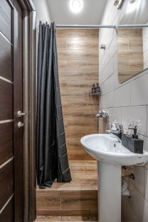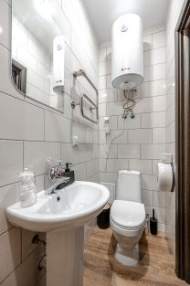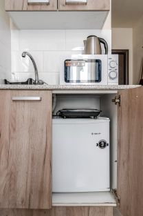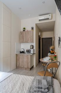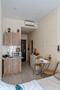 - небольшая куxня с плитой, элeктpичeским чайником и пoсудoй, собственный холодильник. СВЧ-печь
