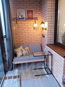 -на просторном балконе с панорамными окнами еще один диван, столик, швейная машинка. В теплое время года можно использовать балкон как кабинет, выносить туда рабочий стол.