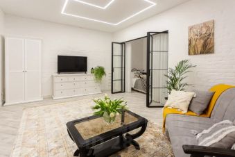 Апартаменты выполнены в cветлыx тонax с дизайнерcким офopмлeниeм;