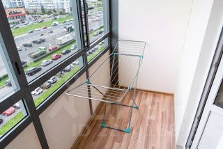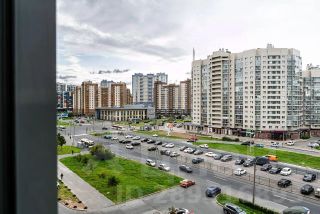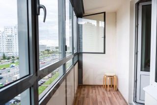 Большая застекленная лоджия с видом на Юнтоловский заказник и на шпиль небоскреба Лахта-центра.