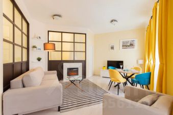 В гостиной удобный диван-кровать, смарт тв Haier диагональю 42, электрический камин Electrolux, зоны тв и столовая.