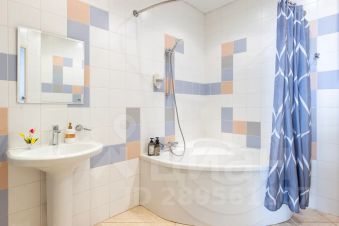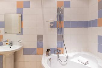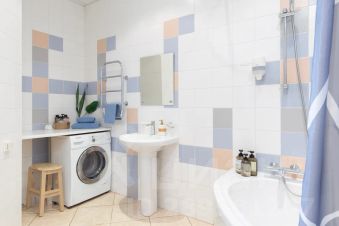 В большом санузле есть ванна, унитаз, биде, стиральная машина и большая столешница, фен. Есть гель для тела и шампунь, мицелярная вода и ватные диски.