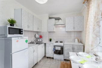 Полноценная кухня с варочной поверхностью, холодильником, свч печью, электрочайником и всей необходимой посудой и кухонной утварью