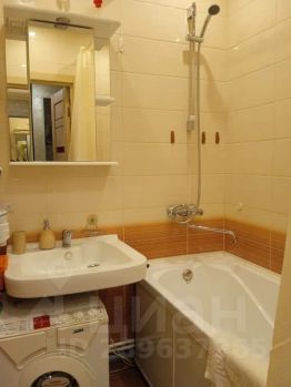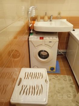 Ванна в санузле, стиральная машина, фен, утюг, гладильная доска, сушилка, средства для принятия душа и стирки.