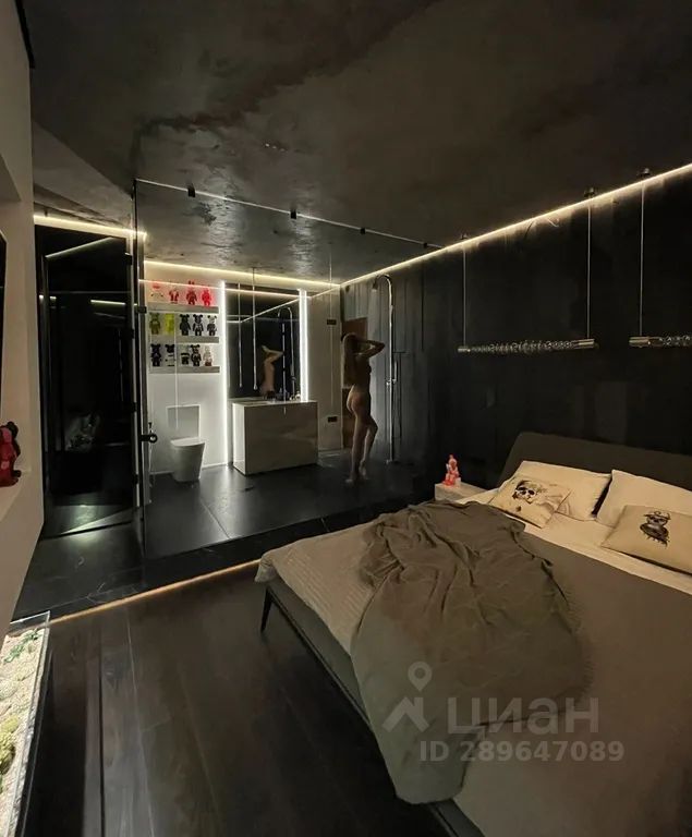 Настоящей изюминкой апартаментов является душевая. Мы полностью снесли все стены и вместо них поставили стеклянные перегородки. А грамотно продуманное освещение позволило создать невероятную атмосферу.