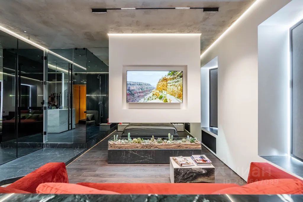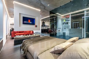Каждая деталь здесь продумана до мелочей, начиная с нестандартного зонирования всего пространства студии, заканчивая авторской сантехникой, привезенной из Европы. Несмотря на небольшую площадь здесь есть полноценная кухня с духовым шкафом и плитой-гриль, гостиная зона с удобной мягкой мебелью, спальня, огромная ванная комната и даже сауна, которая нагревается до 110 градусов.