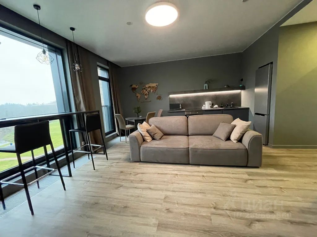 У большого окна в гостиной стоит барная стойка — идеальное место для романтичного вечера с бокалом вина и приглушенным светом или для завтрака с запахом кофе.