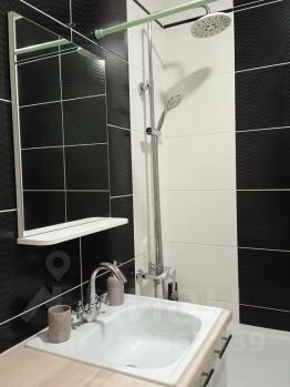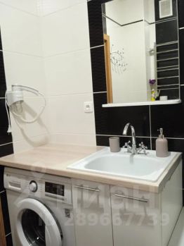 Стильная современная душевая в санузле, стиральная машина, фен, утюг, гладильная доска, сушилка, средства для принятия душа и стирки.