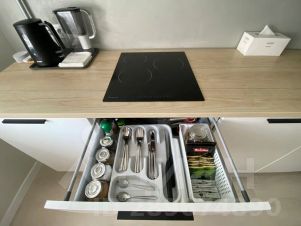 Оснащение кухни: кондиционер, кассетный фильтр для воды, холодильник, варочная панель, микроволновая печь, стиральная машина, посудомоечная машина, электрический чайник, посуда, столовые приборы, кофе, чай, сахар, специи, сопутствующая бытовая химия.