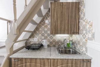 Спальная зона в студии располагается на втором уровне. Мини-кухня на первом уровне снабжена индукционной плитой и специальной посудой для быстрого приготовления завтрака и приёма пищи. В студии располагается санузел с душем. Гостям предоставляется wi-fi, фен, чистое постельное бельё, комплект полотенец по количеству гостей, одноразовые тапочки, моющие средства, средства личной гигиены. На общей территории расположены гладильная доска, утюг, стиральная машина, сушилка, микроволновая печь.