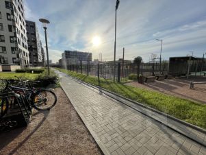 На территории ЖК: школа, детский сад, несколько детских площадок. При выходе из подъезда, спортивные площадки: площадка с тренажерами, футбольная площадка ( с искусственным покрытием), волейбольная, баскетбольная площадки.