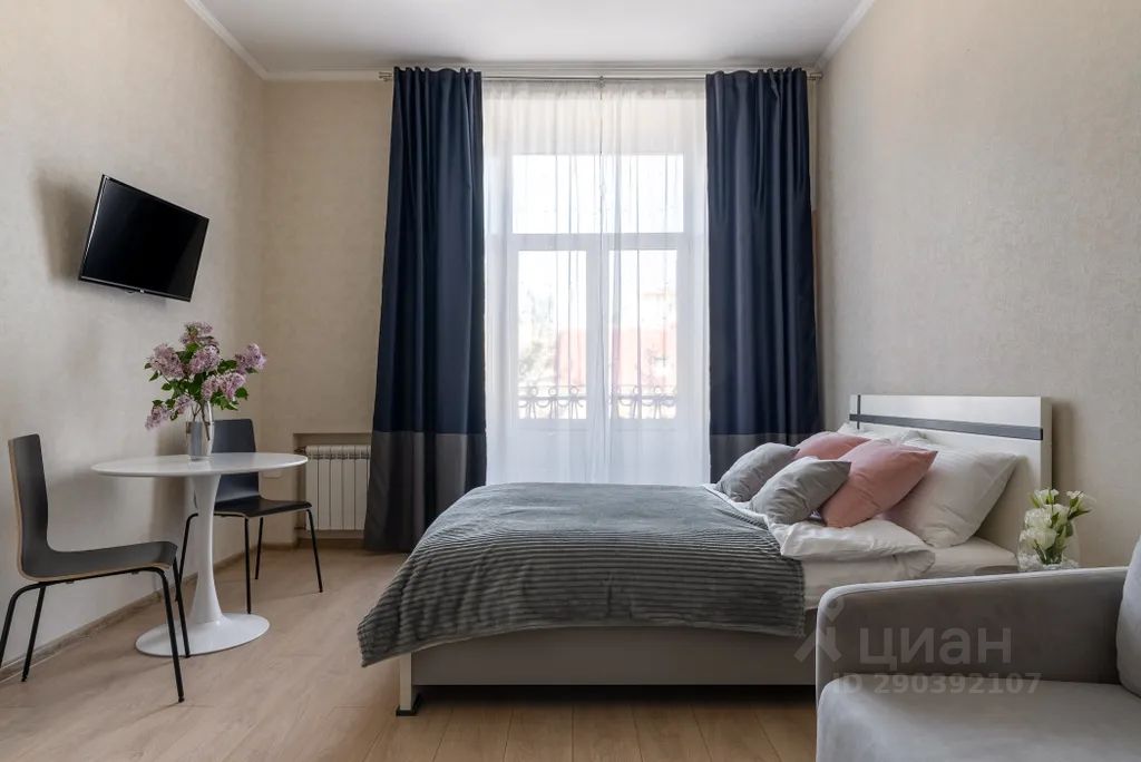 2 спальных места: двуспальная кровать с удобным ортопедическим матрасом и кресло-кровать. Студия оборудована всем необходимым для комфортного проживания: удобная двуспальная кровать, свежее постельное бельё отельного качества, полотенца, телевизор, стиральная машина, варочная панель, холодильник, микроволновая печь, электрочайник, фен, утюг, посуда, столовые принадлежности, сушилка для белья, гладильная доска, wi-fi.