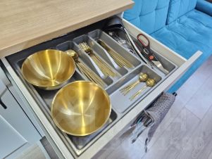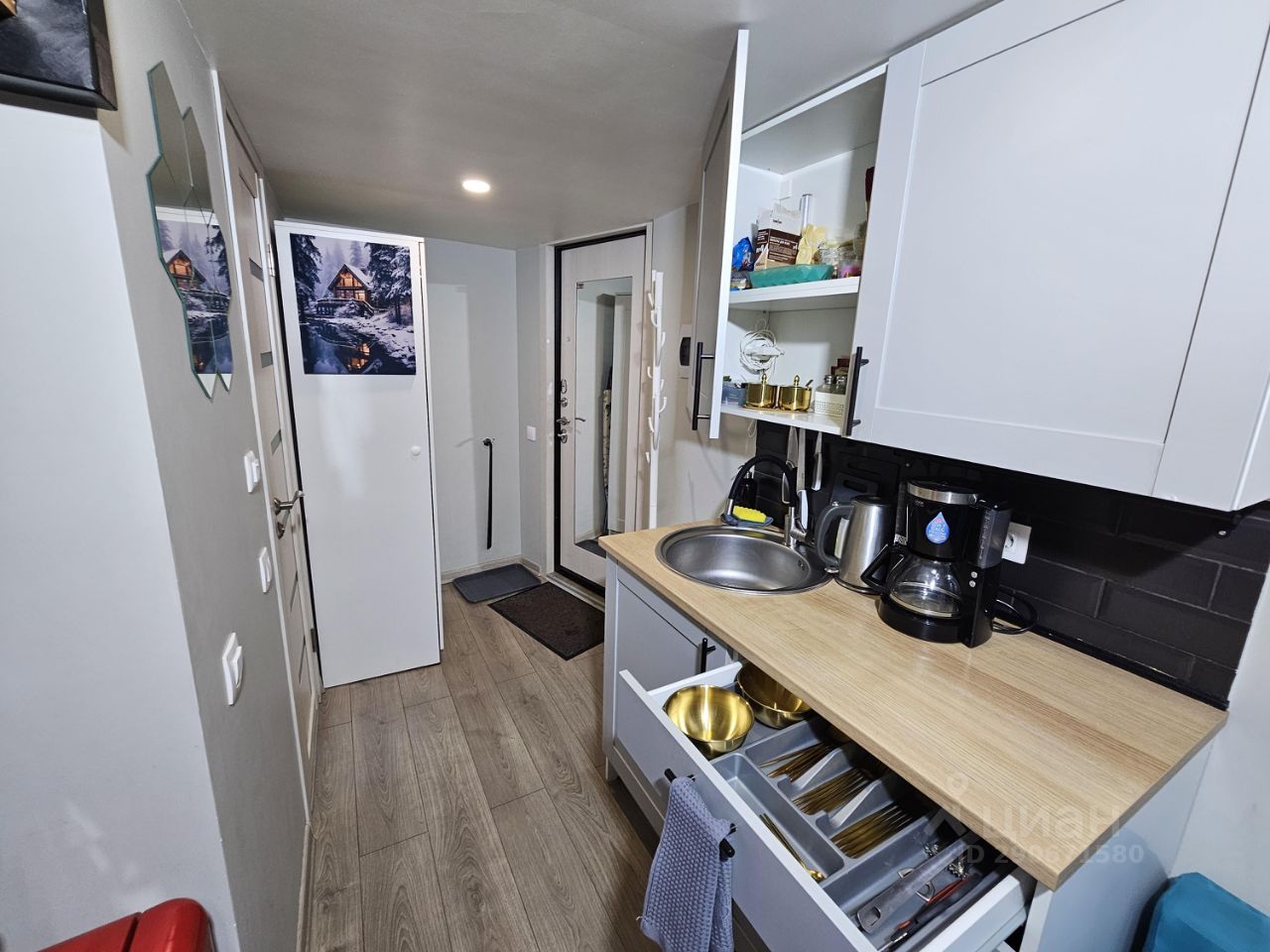 — мини-кухня (посуда, приборы, чайник, кофеварка, плита, холодильник),