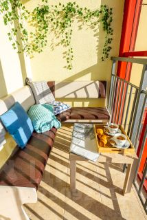 На балконе обустроена зона отдыха, с которой открывается очень красивый вид на город и закат. Возможно размещение до 4 человек.
