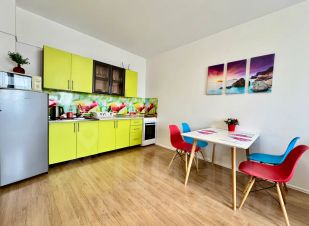 Полноценная кухня с электрической плитой, холодильником, СВЧ печью, электрочайником и всей необходимой посудой
