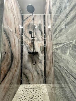 - ванная комната с душем, установлена стиральная машина, имеется фен, гель для душа/шампунь, полотенца.