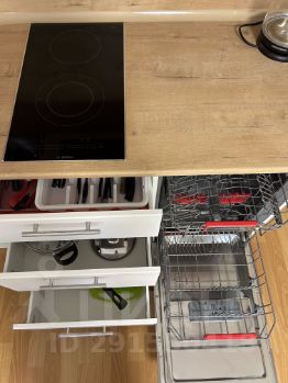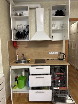 Практичная кухня оборудована всем необходимым для приготовления вкусных блюд. Здесь вы найдете плиту, посудомойку и полный набор посуды, сковородок и кастрюль - жить с комфортом можно с первого дня.