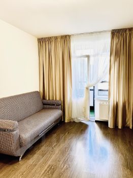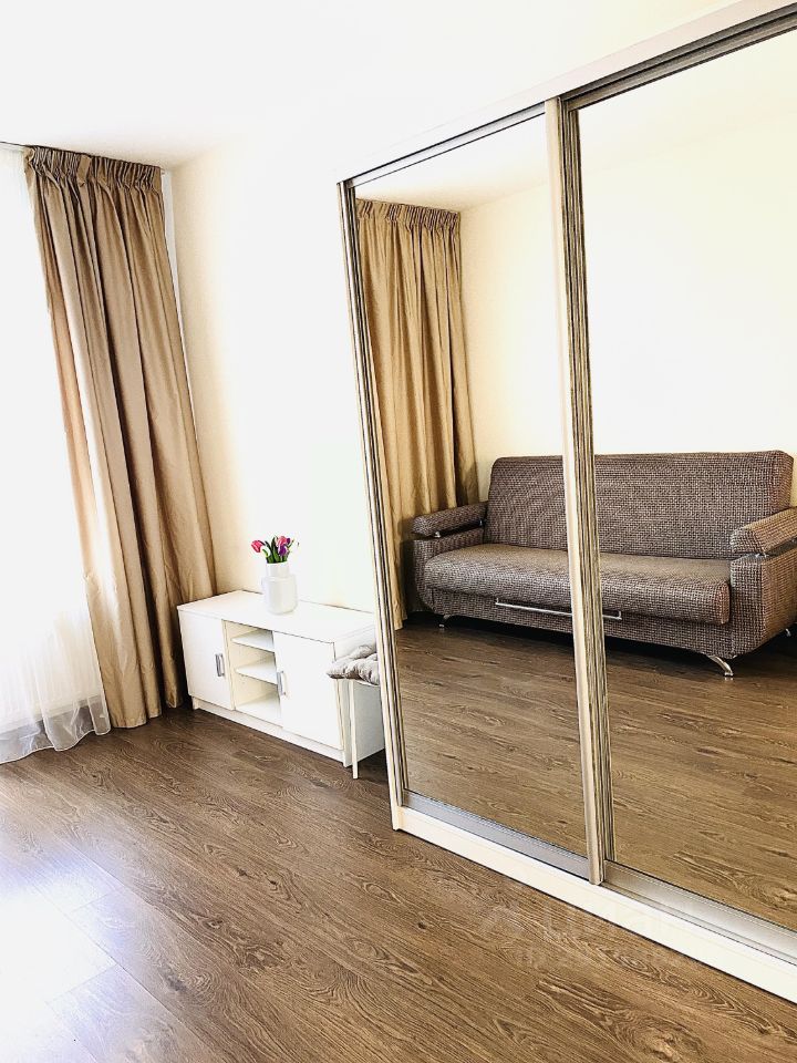 Диван на два спальных места, большой зеркальный шкаф купе. Большая остеклённая лоджия с хорошим видом.