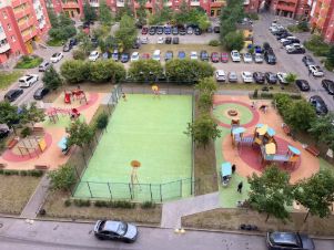 Хорошая детская площадка и баскетбольная площадка во дворе. Безбарьерный проход к лифтам (очень удобно с коляской) В доме есть видео наблюдение.