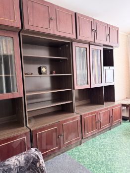 В комнате 18 м. есть стенка для вещей, вешалка открытая напольная, журнальный и обычный стол, диван с удобным матрасом из Икеа, телевизор.