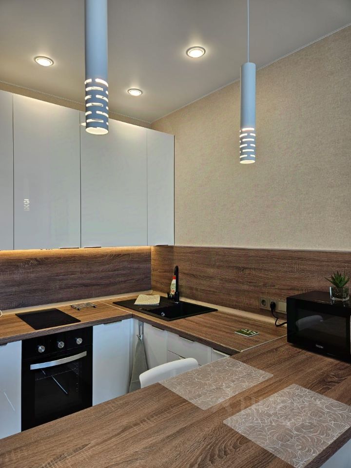 9 этаж. В студии выполнен дизайнерский ремонт с удобным зонированием пространства и применением импортных отделочных материалов. Для проживания есть все необходимое - новая техника и мебель: вместительный кухонный гарнитур с барной стойкой и стульями, оборудованный встроенным духовым шкафом и варочной панелью, имеется холодильник, вытяжка, микроволновка, чайник. Удобный раскладной диван с большим ящиком для хранения, мебель для зоны гостиной. Есть шкаф для хранения вещей. В совмещенном санузле - импортная сантехника и аксессуары, душевая оборудована системой Тропический дождь, стиральная машина. В квартире имеется вместительный застекленный балкон с освещением и прекрасным видом на город и Лахта-центр. Квартира из категории заезжай и живи - в наличии посуда, предметы первой необходимости. Очень симпатичная, теплая и тихая квартира, делалось все под себя.