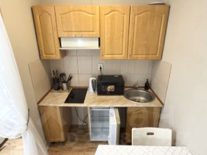 Оборудованная кухонная зона: холодильник, варочная панель, СВЧ,