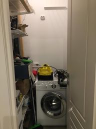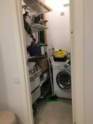 Отдельное хоз. помещение, здесь же сушить белье, гладильная доска, модульная гардеробная система российского производителя Титан. Можно убрать и заряжать самокат.