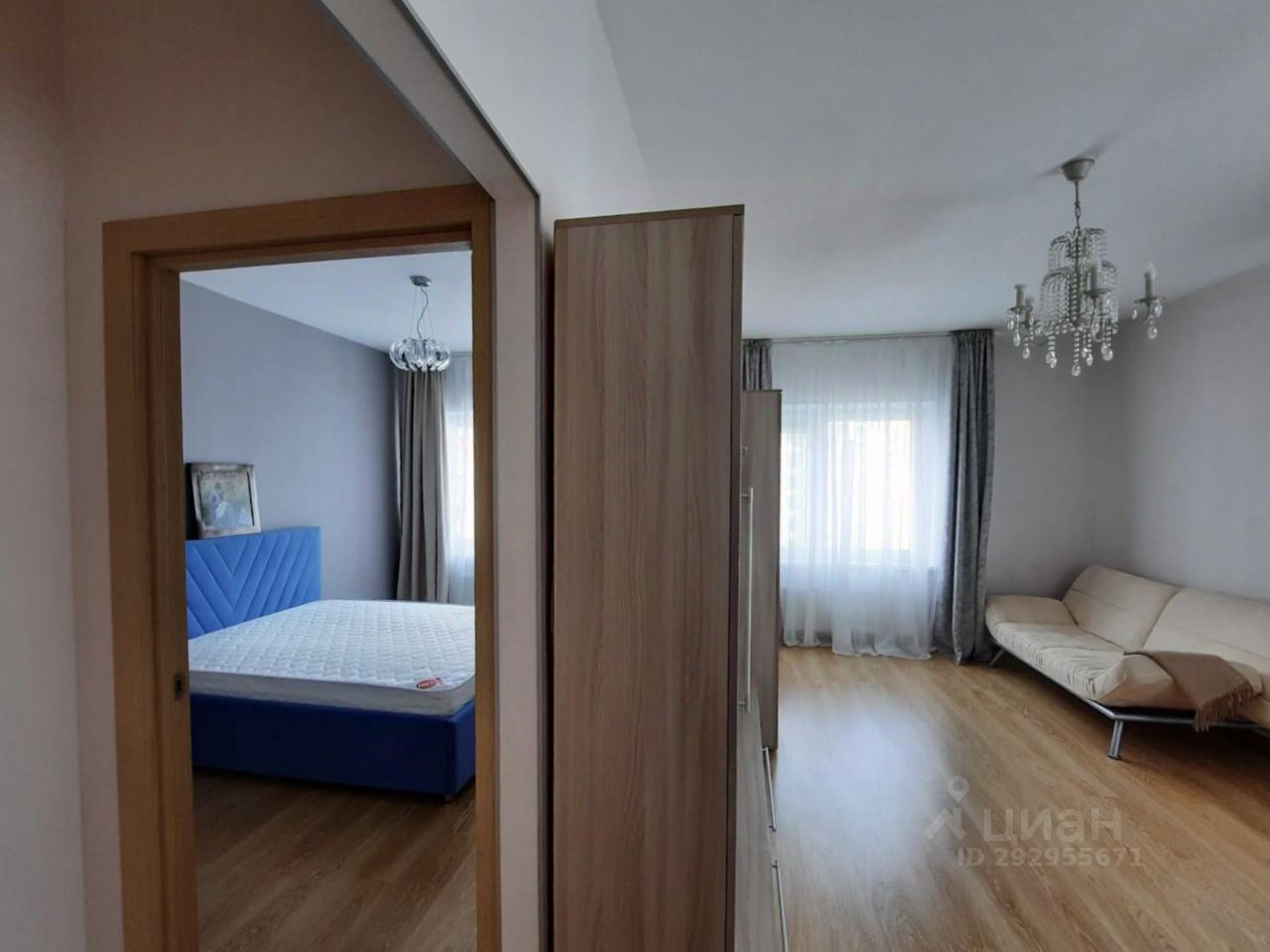 В спальне свежий ремонт, большая двуспальная кровать.