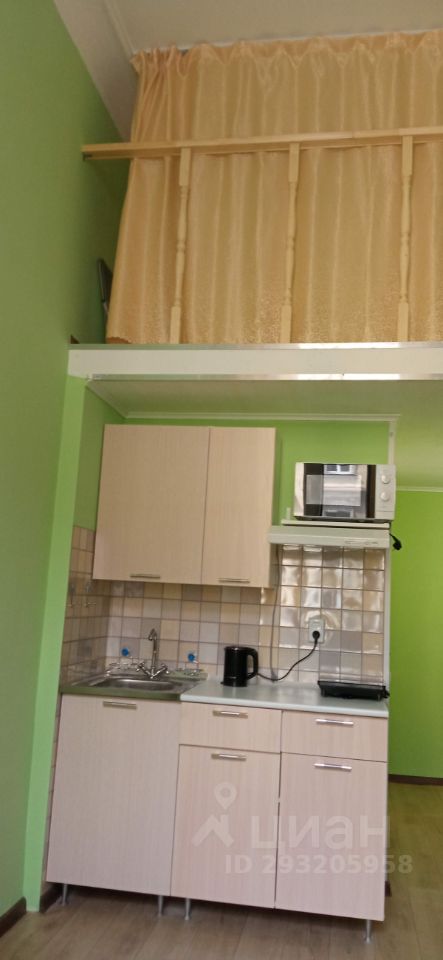 Есть все необходимое для жизни: спальное место на втором ярусе, шкаф, кухонный гарнитур, стол, стулья, электроплитка, плитка, микроволновка, холодильник, чайник, утюг и гладильная доска, сушилка, стиральная машина. Свой санузел с ванной. Высота 2-го яруса 1,6 м.