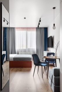 -полностью укомплектованная кухня, с необходимой техникой: микроволновка, электрочайник, варочная панель, мини холодильник с морозилкой, посуда, столовые приборы.
