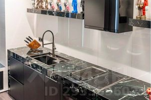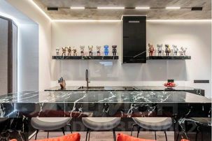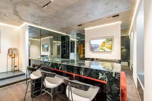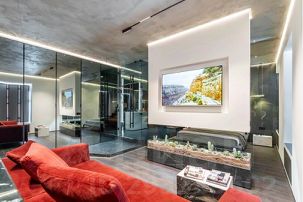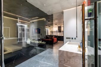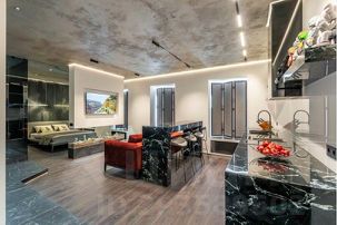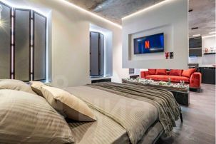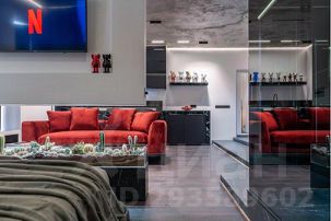 Каждая деталь здесь продумана до мелочей, начиная с нестандартного зонирования всего пространства студии, заканчивая авторской сантехникой, привезенной из Европы. Несмотря на небольшую площадь здесь есть полноценная кухня с духовым шкафом и плитой-гриль, гостиная зона с удобной мягкой мебелью, спальня, огромная ванная комната и даже сауна, которая нагревается до 110 градусов.