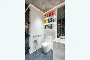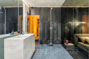 Настоящей изюминкой апартаментов является душевая. Мы полностью снесли все стены и вместо них поставили стеклянные перегородки. А грамотно продуманное освещение позволило создать невероятную атмосферу.